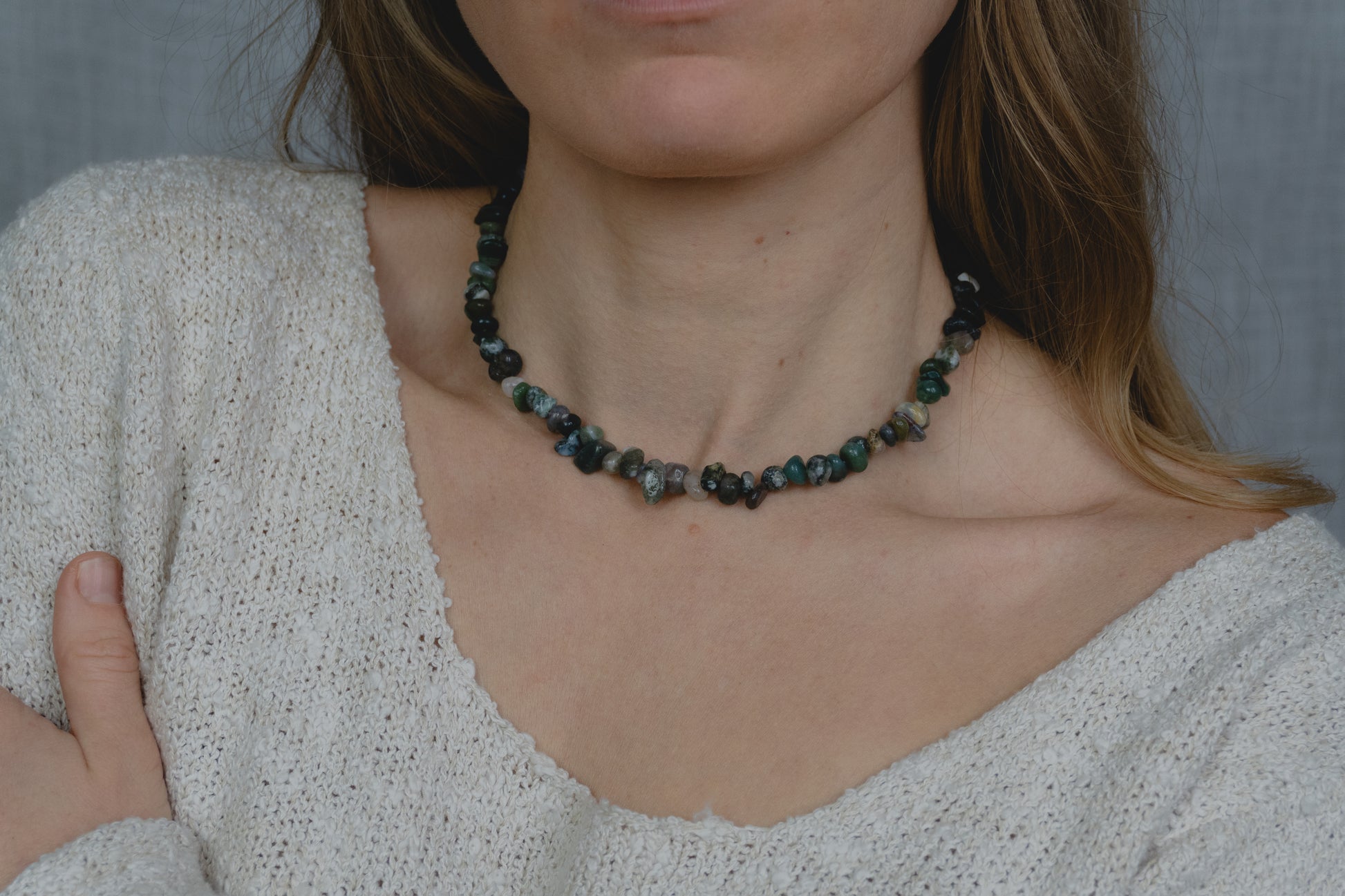 Der Baumachat verknüpft dich mit der ruhigen, erdenden Kraft der Natur. Seine moosartigen Einschlüsse symbolisieren Wachstum, Stabilität und Gelassenheit. Diese Kette hilft dir, dich in hektischen Zeiten auf das Wesentliche zu konzentrieren und innere Ruhe zu finden. Trage sie, um dich geerdet zu fühlen, deine Wurzeln zu spüren und dich mit der Weisheit der Erde zu verbinden.