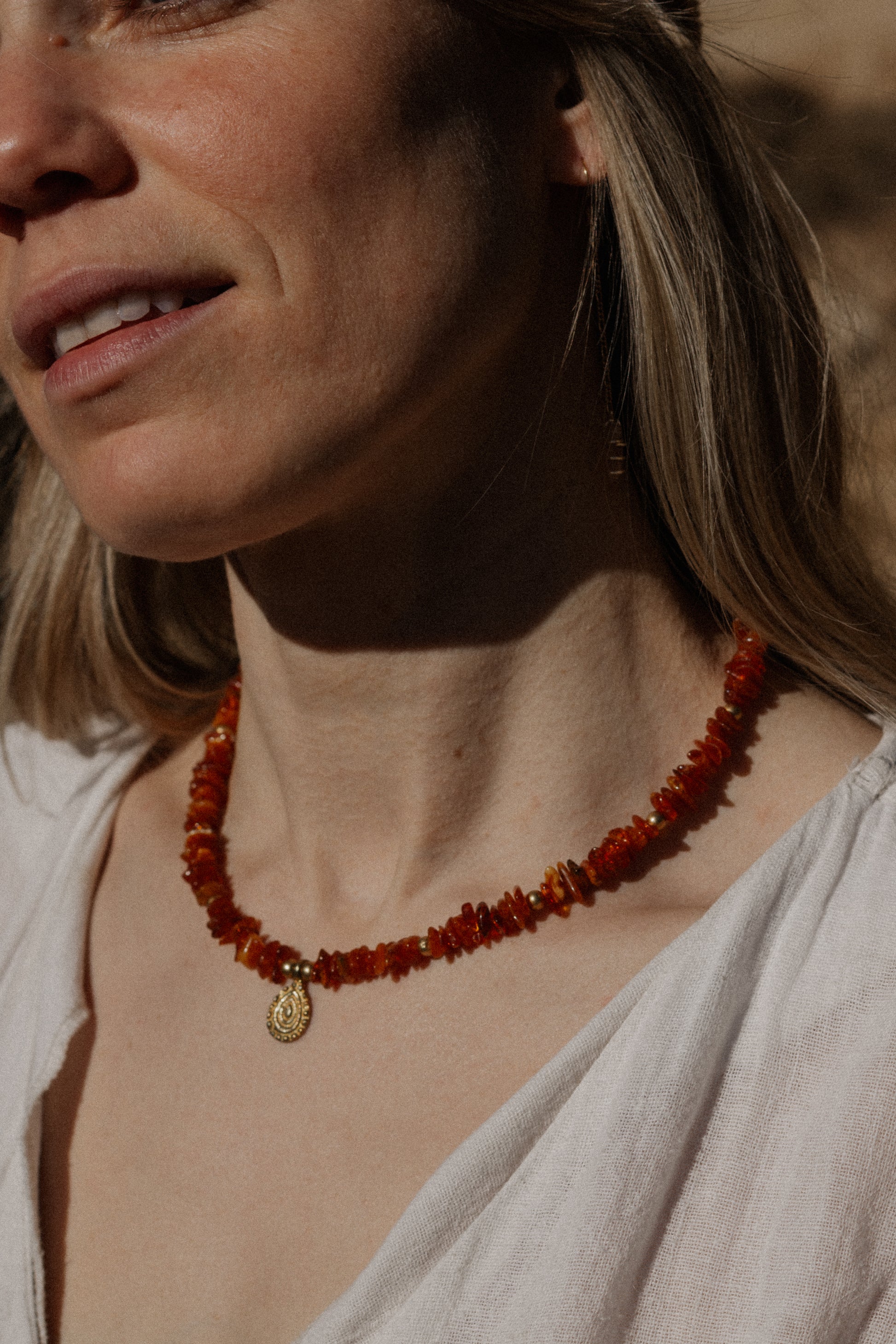 GOLDEN GLOW · Bernstein Halskette mit Messing Anhänger