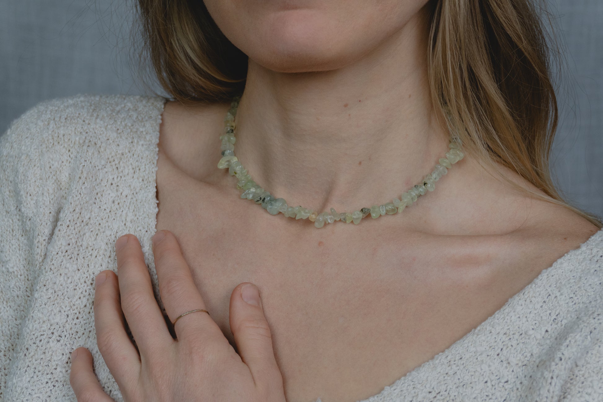 Prehnit ist der Stein der bedingungslosen Liebe und Hingabe. Sein sanftes Grün erinnert an frische Blätter, die Hoffnung und Erneuerung symbolisieren. Diese Kette unterstützt dich dabei, alte Wunden zu heilen, Vertrauen in den Lebensfluss zu fassen und mit deinem Herzen in Einklang zu kommen. Trage sie, um dich für neue Erfahrungen zu öffnen und liebevoll getragen zu fühlen.