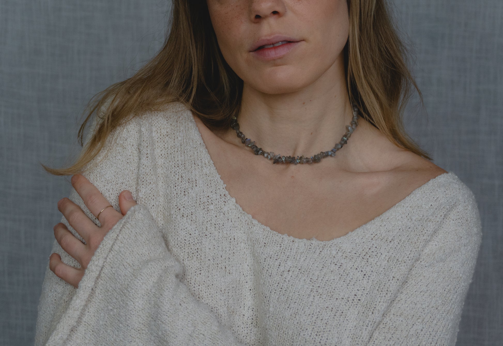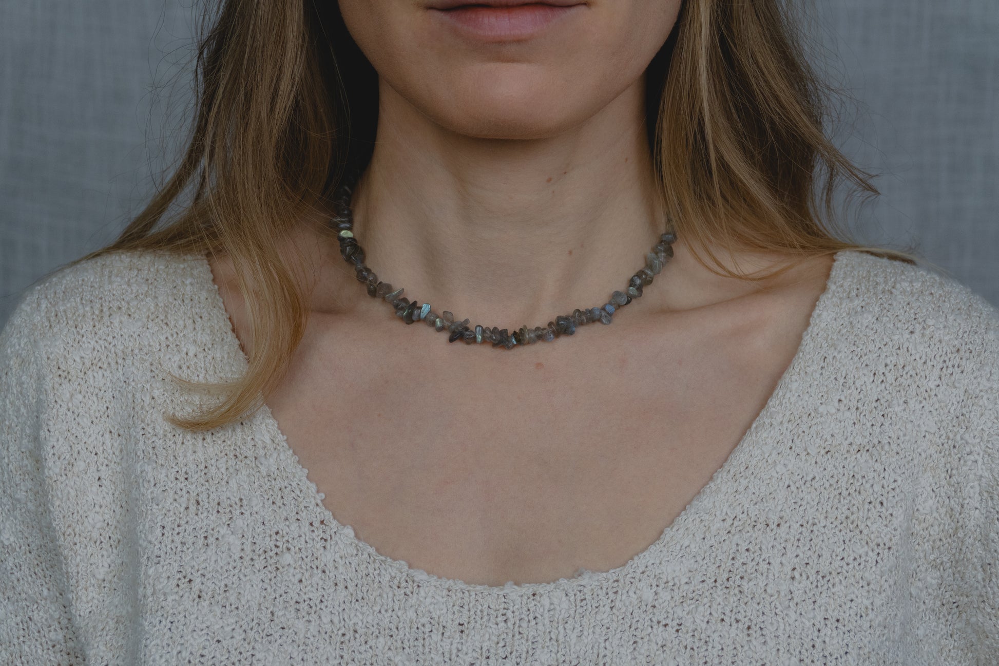 Die Labradorit-Splitterkette ist wie ein Tor zu einer Welt voller Magie und Mystik. Jeder facettenreiche Stein, den ich mit Liebe von Hand aufgereiht habe, trägt ein geheimnisvolles Farbenspiel in sich, das im Licht schimmert und die verborgene Kraft dieses Edelsteins offenbart. Labradorit wird oft als Schutzstein angesehen, der dich dabei unterstützt, deine Intuition zu stärken und deine innere Wahrheit zu entdecken.