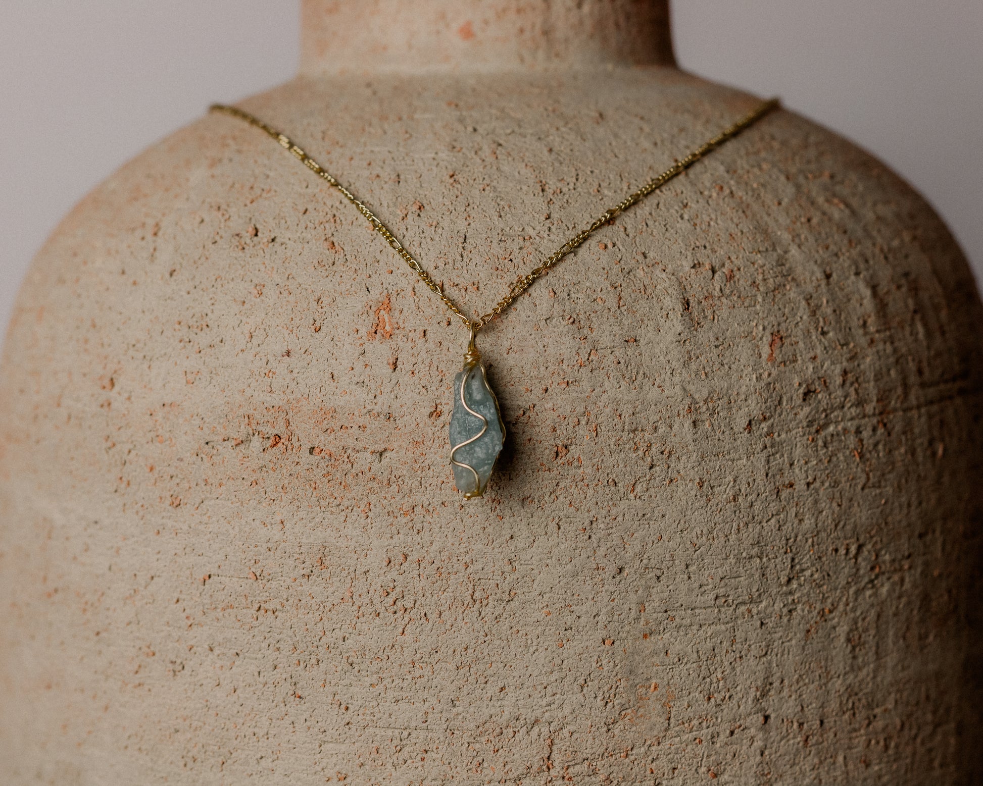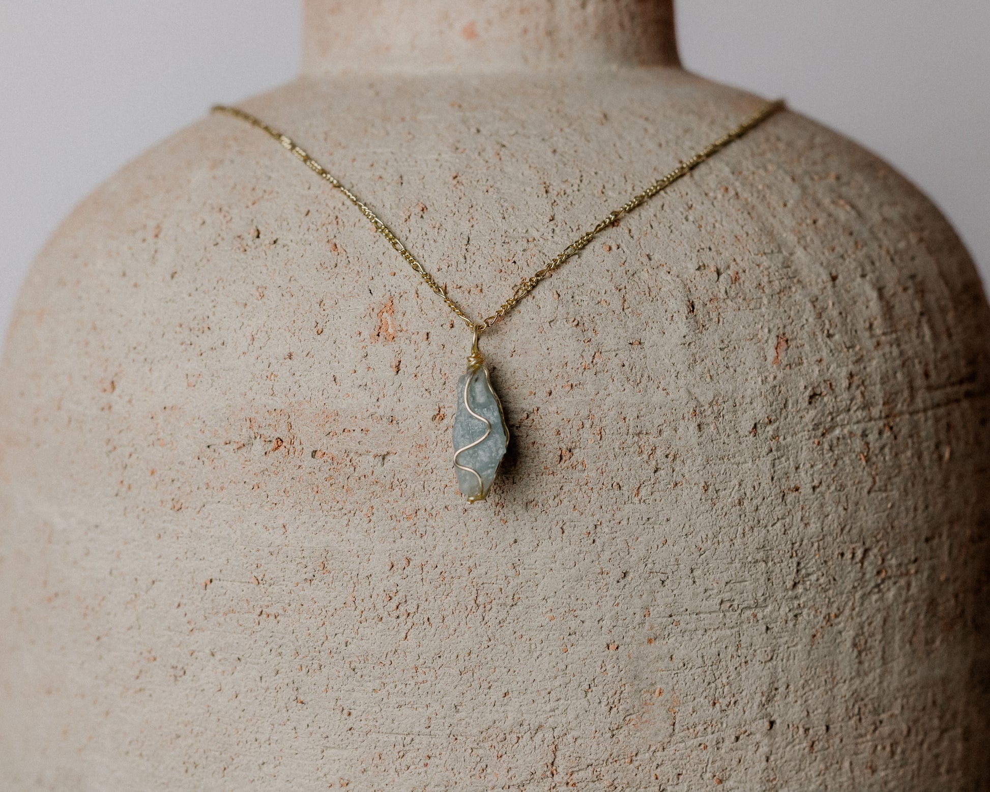 Diese handgefertigte Kette trägt einen rohen Aquamarin, eingefasst in verspieltem Drahtdesign – wahlweise in zartem Silber oder warmem Gold.